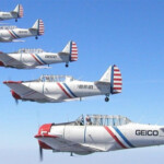 The squadron, known as the “GEICO SKYTYPERS”, skytype above the audience and perform a low level precision formation airshow in their WWII era aircaft. This low level airshow enables the crowd to see the clients logos and branding on the aircraft and brings high engery of noise and professional flying that captures the audience. After landing, the aircraft are prominently displayed with GEICO logos and signage while pilots answer questions, pose for photos and sign autographs.