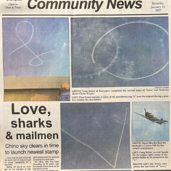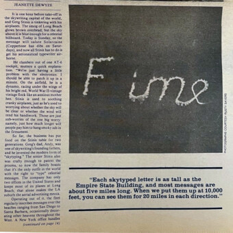 Black and white cover of San Diego's Reader: airplane flying over the city with headline "Heaven Is My Billboard.Skytypers began operations in 1932 when a little known beverage company hired Andy Stinis to do skywriting to promote its product. The beverage company was Pepsi-Cola and for the next 22 years utilized skywriting as its major mass advertising medium to build brand awareness. In 1946, Andy developed “skytyping” – a faster, more advanced method of skywriting using multiple aircraft to display more complex sky displays and messages. Skytyping provides a high-quality message that is not only clearly readable at large distances, it stays intact longer. The patent for computer controlled skytyping between multiple aircraft was awarded to Andy in 1964 (US Patent 3,151,410). In 1979, Andy’s son Greg Stinis, formed Skytypers, Inc. taking over all patents and rights to continue his father’s business legacy.